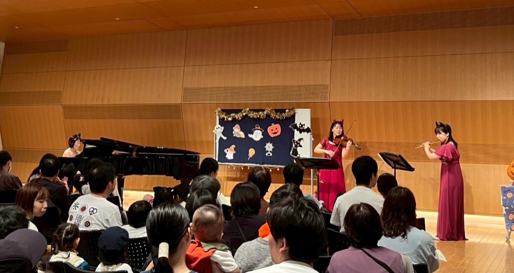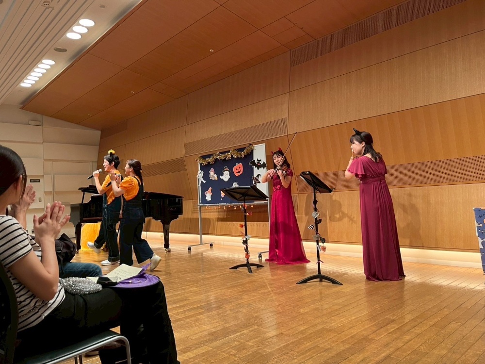 今回はハロウィンにちなんだおばけの曲や季節の歌、ディズニーやリトミックなど楽しい曲満載で、演奏しながら自分も一緒に楽しんでいました。